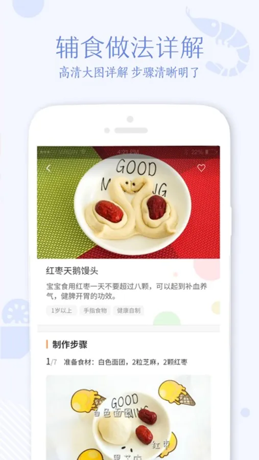2,食谱内容全面,食物的营养介绍,食材配比,制作步骤都非常详细,一步步的教您如何制作营养辅食,一学就会;