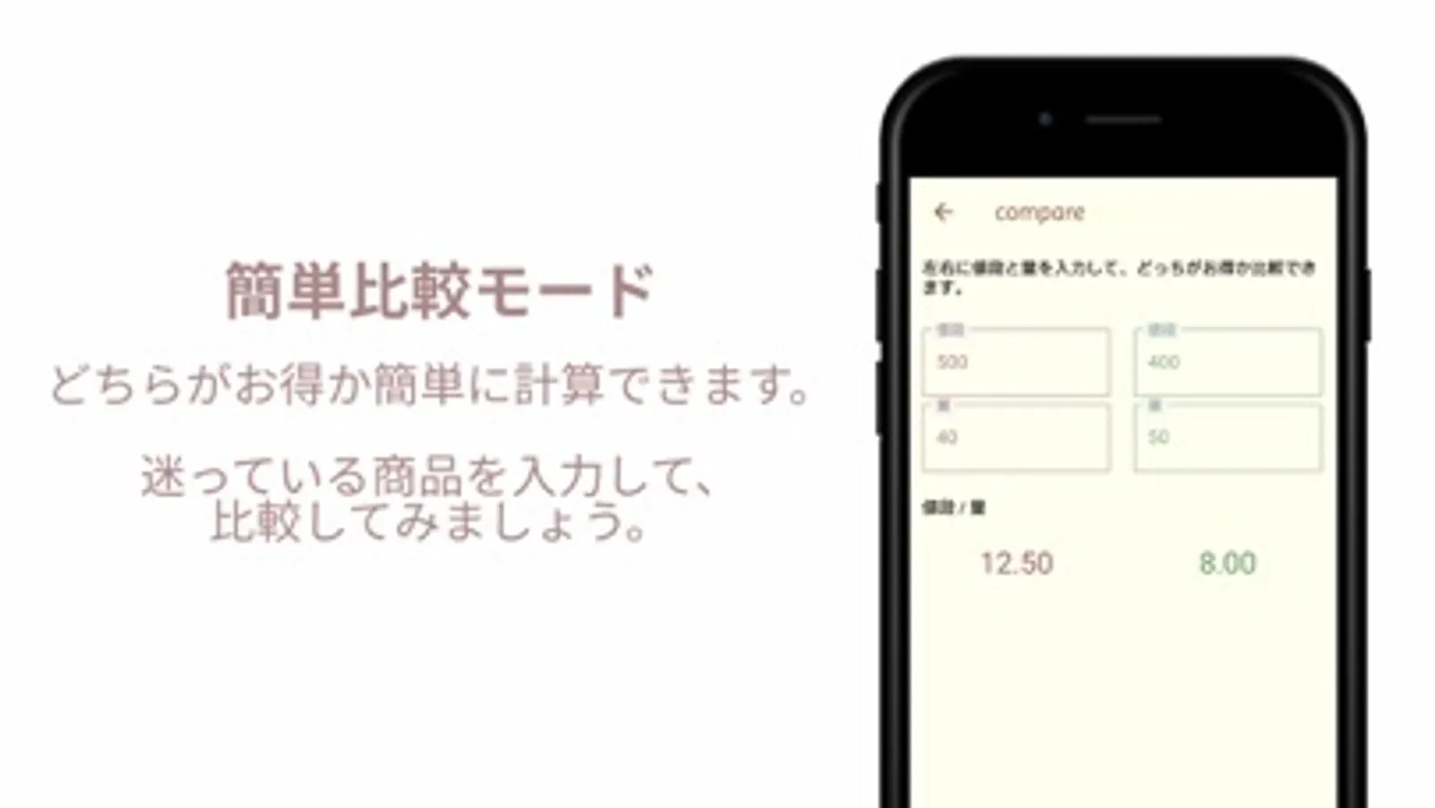 簡単に2つの商品を比較できるモードを搭載しています。特に記録する必要がない場合など、さくっと計算・比較ができる便利な機能です。
