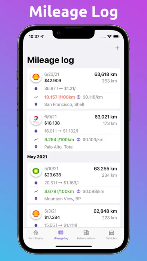 See the overview of mileage, gas costs for one or more vehicles. Supports different fuel types and now also bi-fuel vehicles.