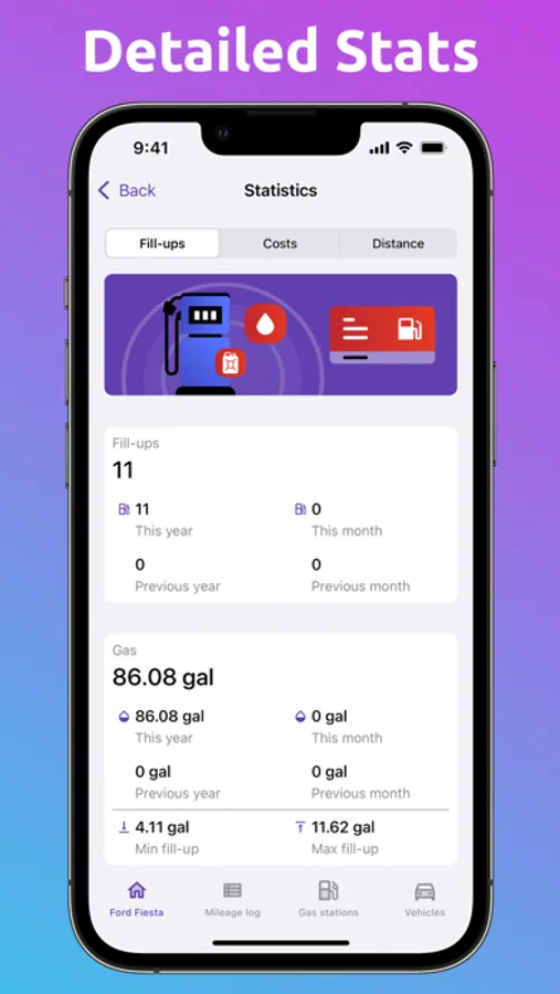 • Detailed Stats (Fill-ups, Costs, Distance)