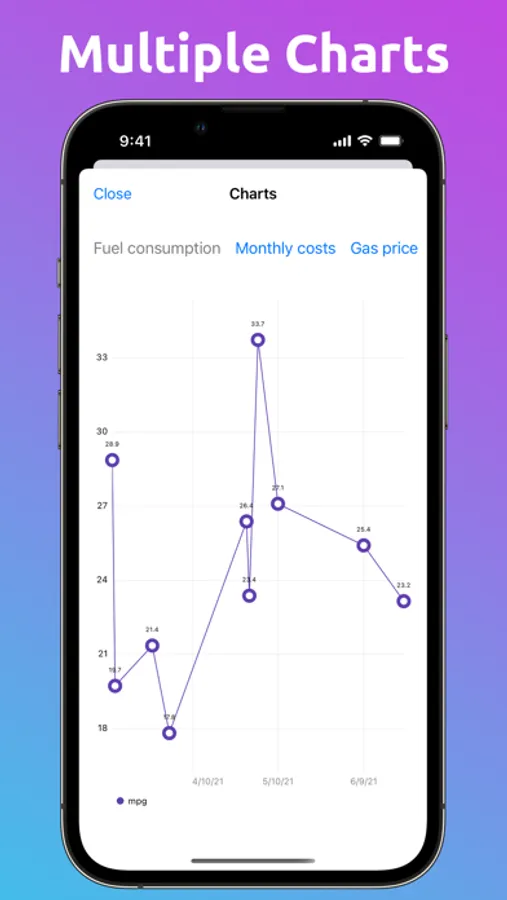 • Charts (Fuel consumption, Monthly costs, Gas price, Fill-up Costs, Total odometer, Cost per mile/kilometer)