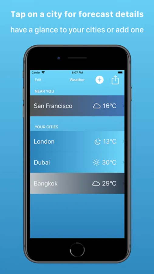 My Weather Pro+ is your window into current weather conditions with forecast data available at a glance. The list lets you quickly check the weather in all your favorite locations.