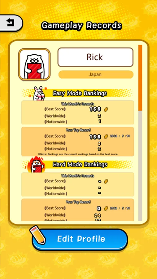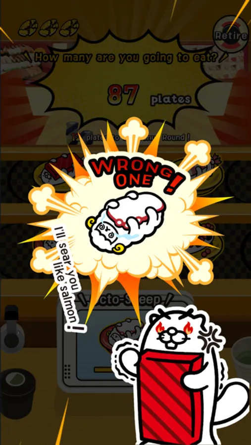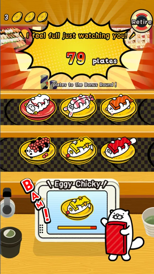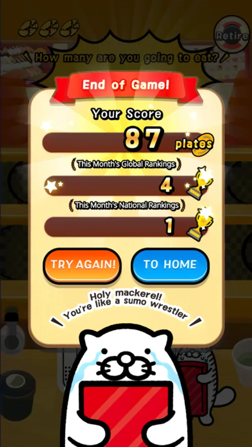 The score you accumulate by tapping the correct Dakko sushi is displayed in the worldwide and national monthly rankings. When certain conditions are met, 'Dak! Dak! Dak! Mode will be activated, and you can aim to boost your score. Your highest score will be listed on the records, so try your best break the top record.