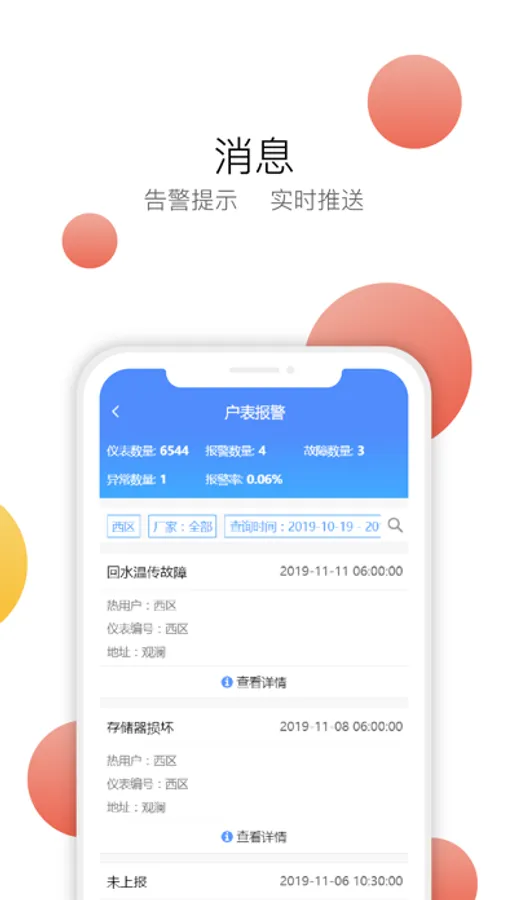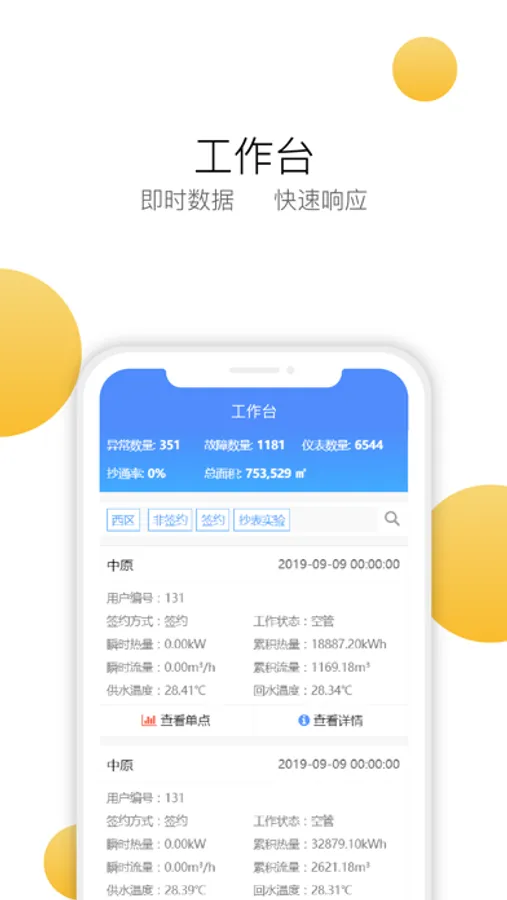 供热计量APP 是汇中供热计量管理系统的配套移动端应用,主要包含计量户、采集器、仪表等基础信息录入,监测数据查看,告警数据查看及处理,工单生成与工单处理,采集器远程调试控制等功能。配合供热计量管理系统一起使用,主要解决供热企业在施行供热计量改革中面临的实际问题。