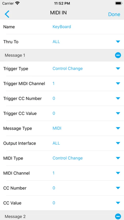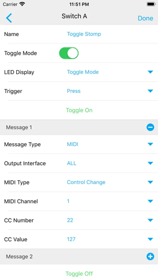 APP内可自由定义AIRSTEP硬件端发送消息的所有参数,包括全功能MIDI消息、HID消息、Footswitch消息,同时支持自由选择输出接口。