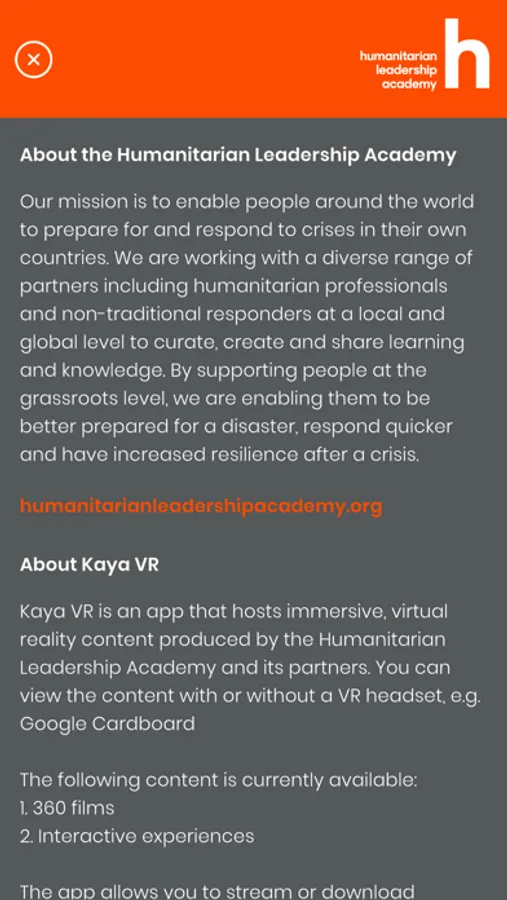 Kaya VR is an app that hosts immersive, virtual reality content produced by the Humanitarian Leadership Academy and its partners. You can view the content with or without a VR headset, e.g. Google Cardboard