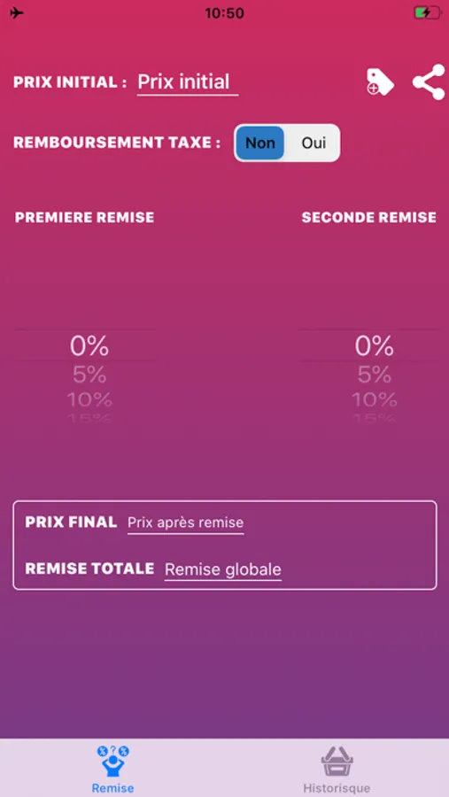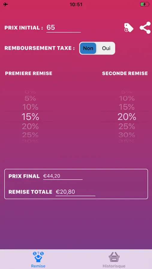 Son fonctionnement est très simple et rapide. Tu entres le prix initial de l'article puis la première et si tu as fais une bonne affaire la seconde remise. Tu obtiendras immédiatement le nouveau prix ainsi que la somme économisée.