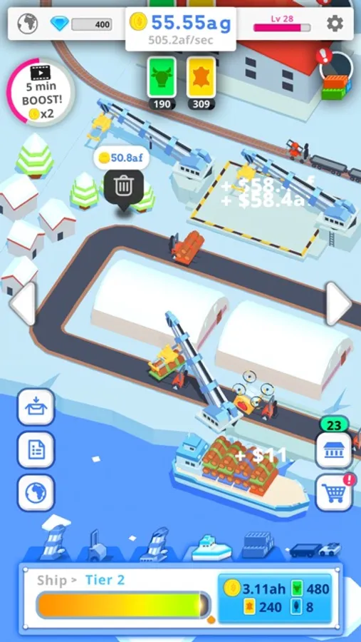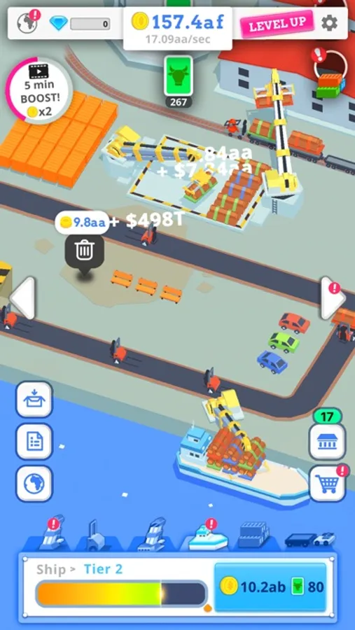 Keep counting that coin as ships doc in your harbor, bringing you even more shipping containers. Tap to increase your specs, gain more materials, build your empire and level up to the max!