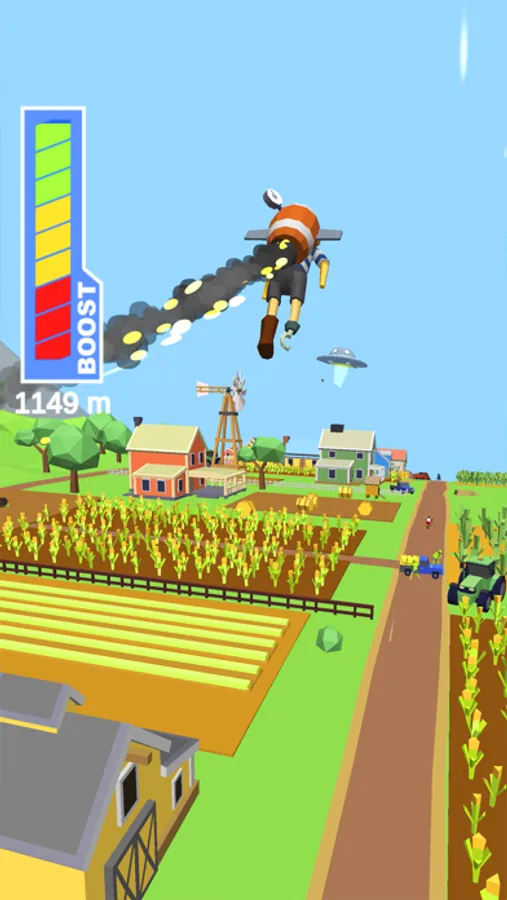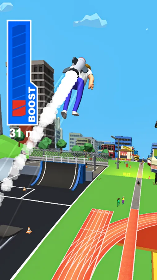 Tap to speed up your BMX and jump off the high ramp as far as you can go. Use the jetpack to boost the jump and cover more distance! The further you travel, the more rewards you get!