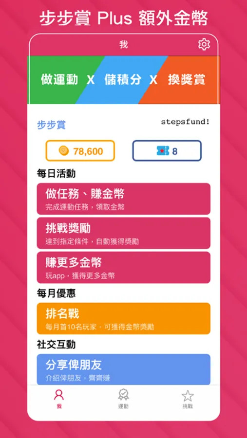 「步步賞 plus」結合運動與遊戲元素,同時提升用家獲得積分嘅能力,運動從此變得不再單一,立刻叫朋友一起做運動啦!