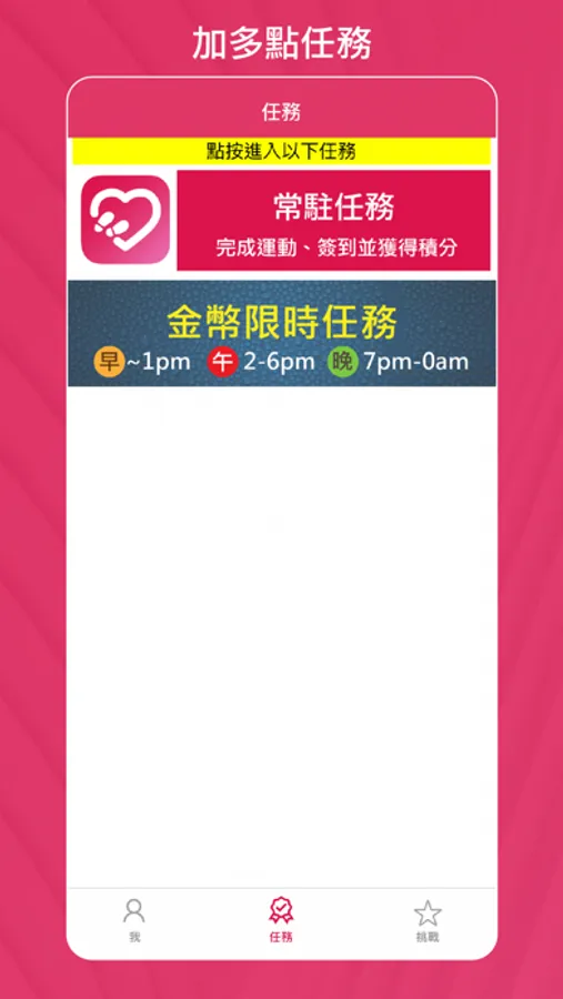 做夠運動量迎接突如其來的任務。每時段都設有限額,越早完成,就可獲得積分。