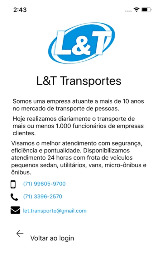 Este aplicativo permite às empresas clientes da L&T Transporte o agendamento e transporte dos seus funcionários usando a frota própria e parceiros, viabilizando a condução de casa para o trabalho de forma agendada e segura.