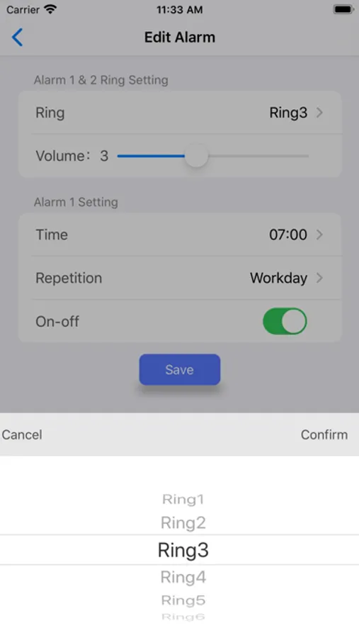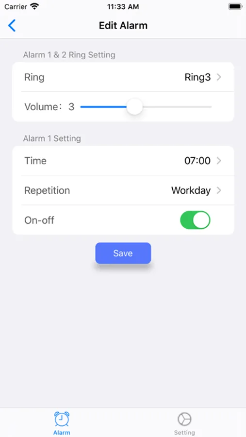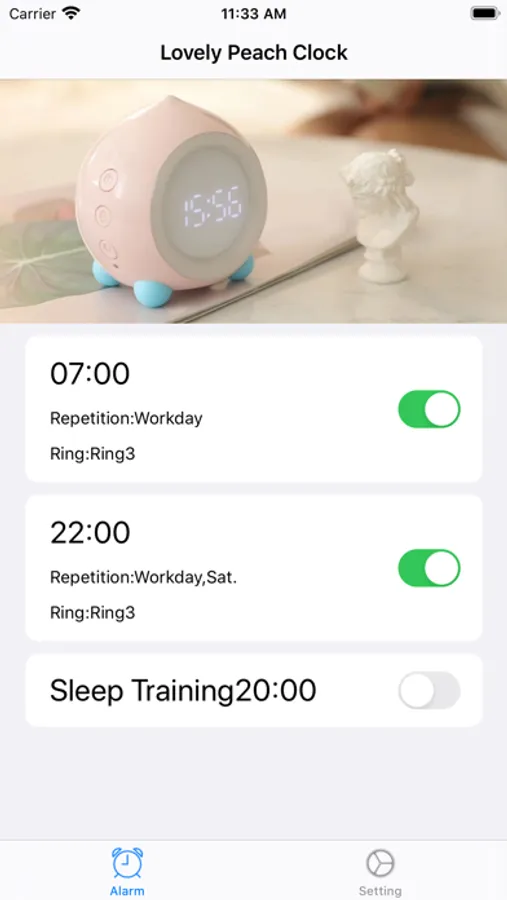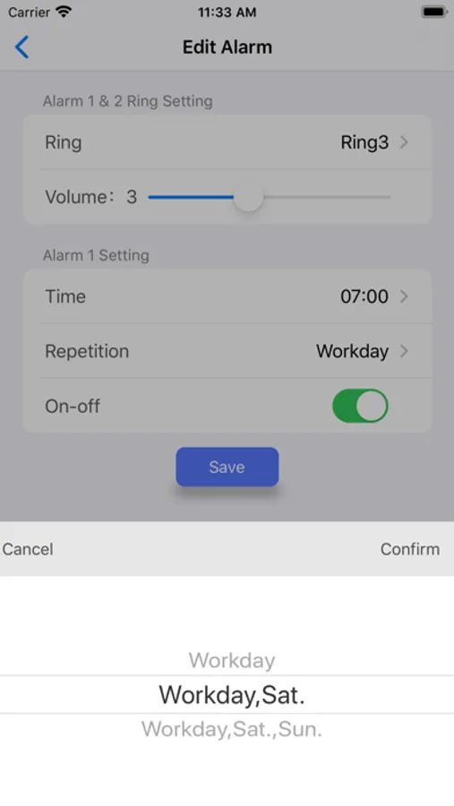 Two groups of alarm clocks include working day/weekend day humanization mode.