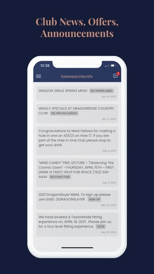 • Get the latest club news, event updates, exclusive offers, and course conditions right on your app home screen.