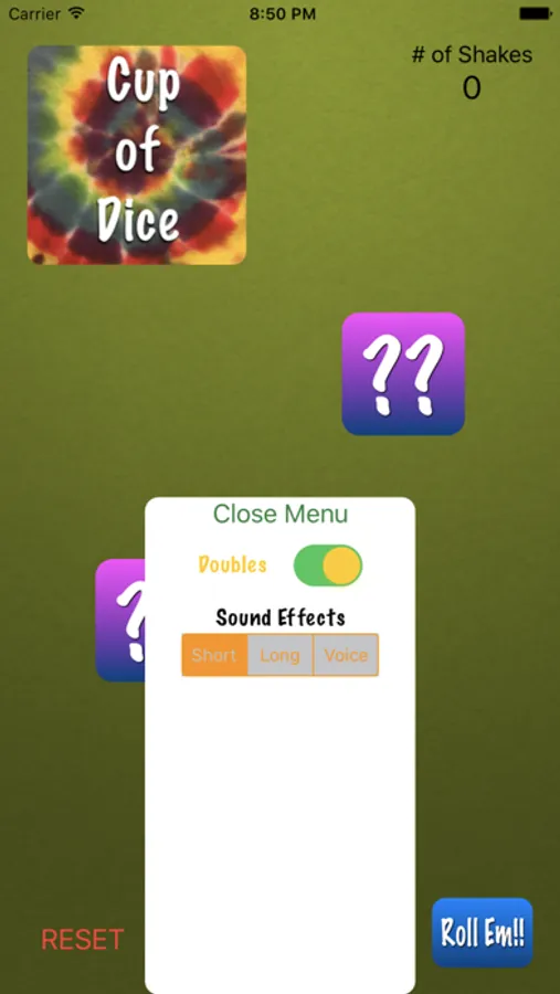 All the fun of a dice cup in your device! With the added Doubles sound effect you can tell if cousin Shannon really rolled doubles or not... The game will give you 3 rolls before you need to reset. If you roll Doubles it will finish the turn automatically. Have fun!!