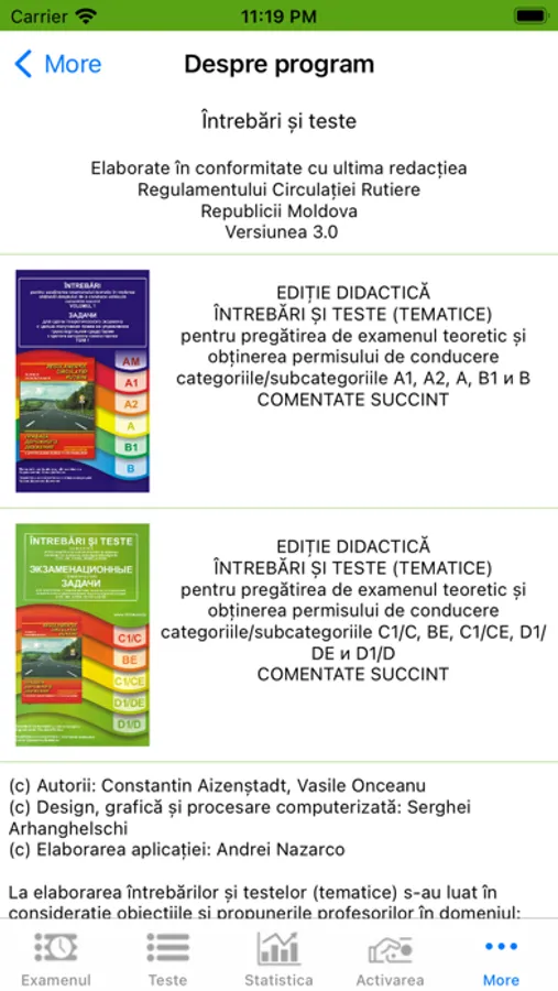 Retipărirea, reeditarea, difuzarea, modificarea sau altă utilizare a Întrebărilor și testelor (tematice) în cauză, fără acordul autorilor, la fel și însușirea dreptului de autor atrage responsabilitatea stipulată în articolele 37 și 38, Legea Republicii Moldova «Cu privirea la dreptul de autor și drepturi înrudite», articolul 51(2) al Codului al Republicii Moldova cu privire la contravențiile administrative, articolul 185/1 alin. (6) lit. e) al Codului penal Republicii Moldova.