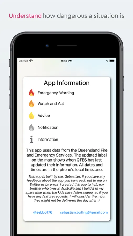 If you live in Queensland and need information about bushfires, then this app is for you! It will show all information from Queensland Fire and Emergency Services printed out on a map.