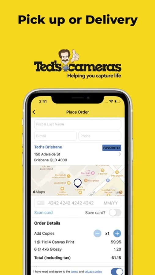 With 20 stores across Australia and 100% Australian stock, the Ted's Photo Prints app automatically finds your nearest Ted's Cameras Photo Centre. Search for a photo lab nearby or find the photo printing store that suits you best. Its super simple to print photos near you. With one tap you can find your nearest photo printing store and pay pickup. Choose from your nearest Ted's across Australia, and enjoy photo printing with local pickup and photo print delivery costs are a thing of the past when you print photos direct from the Teds Photo Prints app. Alternatively you can order digital prints and photo gifts home delivered anywhere in Australia.