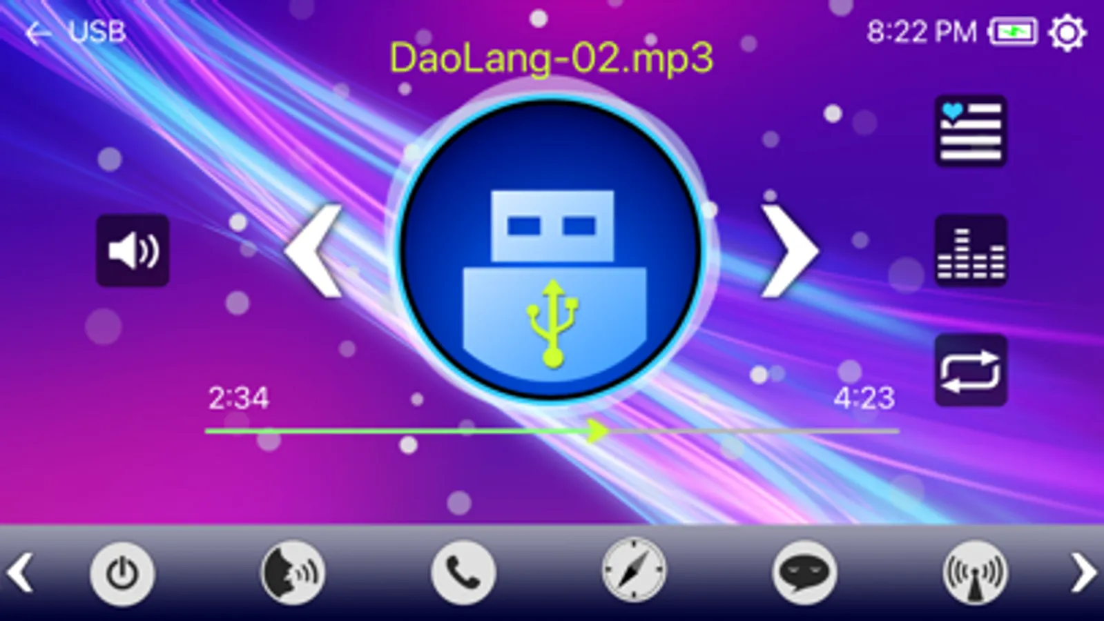 Car audio system’s time is synchronized with smart-phone, background picture of APP can be set between various pictures, setting default navigation software, setting 7 color lights, etc.