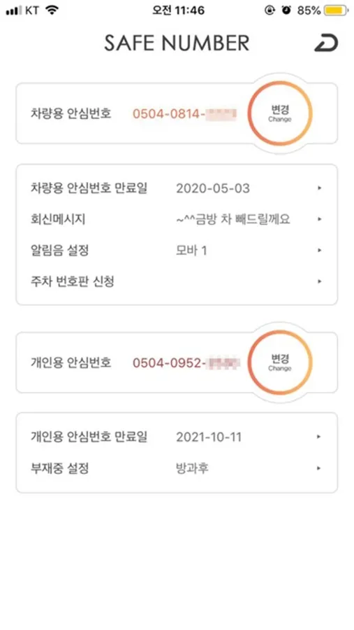 기본 제공되는 차량 안심번호 외에 추가로 개인용 안심번호도 제공해 드립니다.