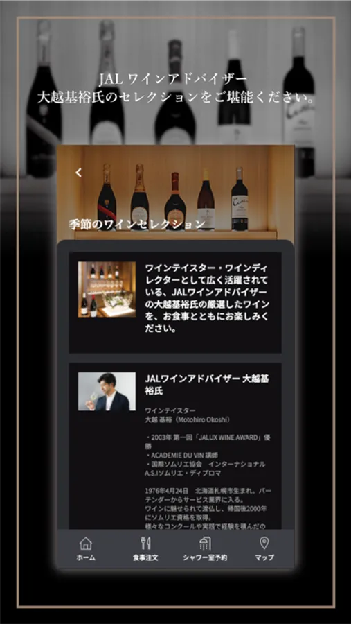 Information about "JAL Wine Advisor Motohiro Okoshi" who selects "Seasonal Wine Selection".
