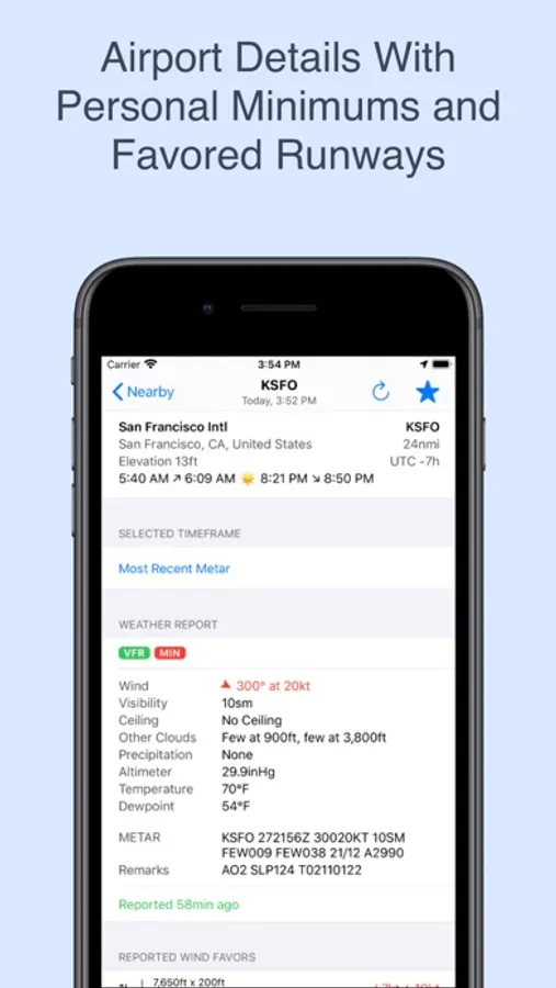 - Get airport details including sunset and sunrise. And directly see which runways the reported or forecasted wind is favoring!