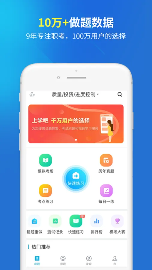 上学吧监理工程师APP有模拟考场、历年真题练习、快速练习、考点练习、考试押题、做题记录等多种学习与做题模式、丰富多样化的陪你一起考监理工程师。
