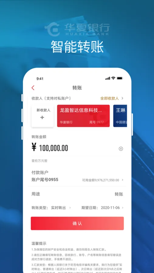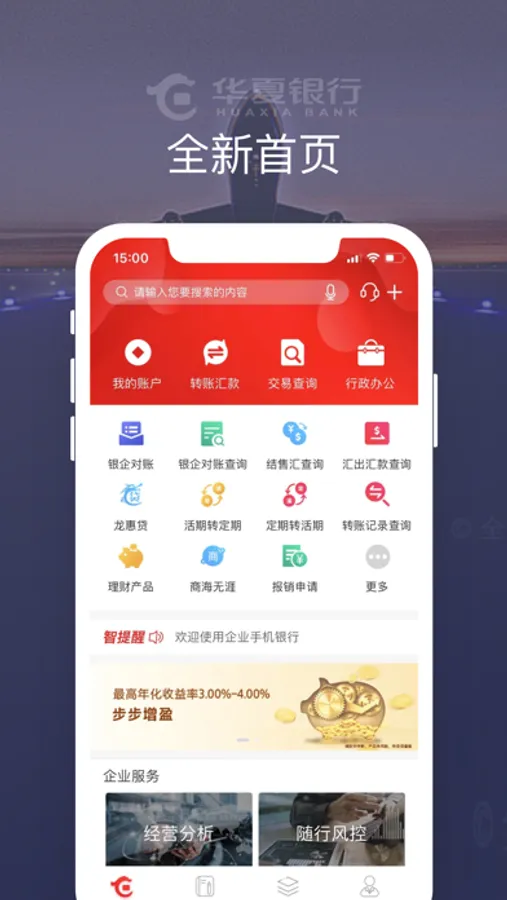 “华夏企业银行”提供转账汇款、银企对账、授权、存款、理财、融资、跨境金融查询、移动报销、移动签到等功能,还提供以大数据为基础的经营分析、信用报告、商海无涯、伙伴无价、随行风控等增值功能,帮助中小企业在移动端便捷管理生意伙伴,拓宽生意圈,防范经营风险。