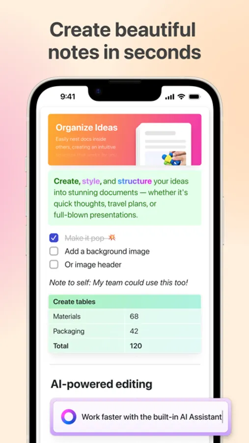 Work faster with the built-in AI Assistant. Instantly brainstorm ideas, summarize long documents or edit your notes for tone and style.