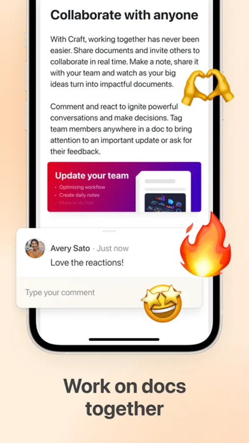 With Craft, working together has never been easier. Share documents and invite others to collaborate in real-time. Exchange ideas, comment and react, and create impactful documents as a team.