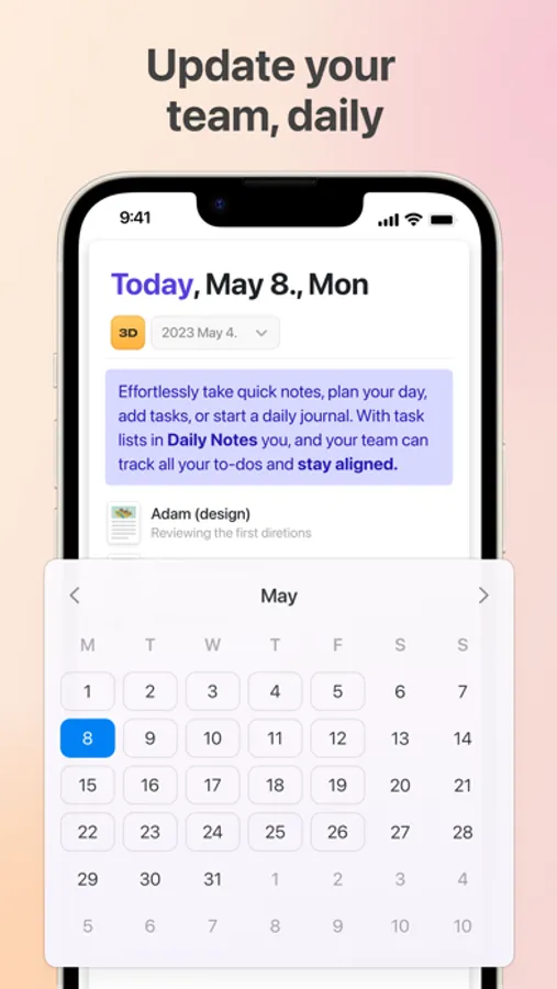 Effortlessly take quick notes, plan your day, add tasks, or start a daily journal. With task lists in Daily Notes you, and your team can track all your to-dos and stay aligned.