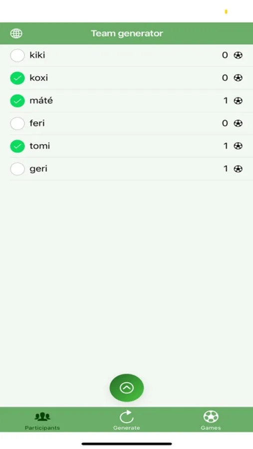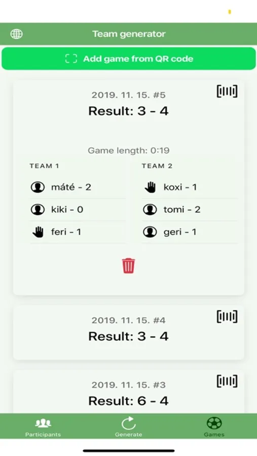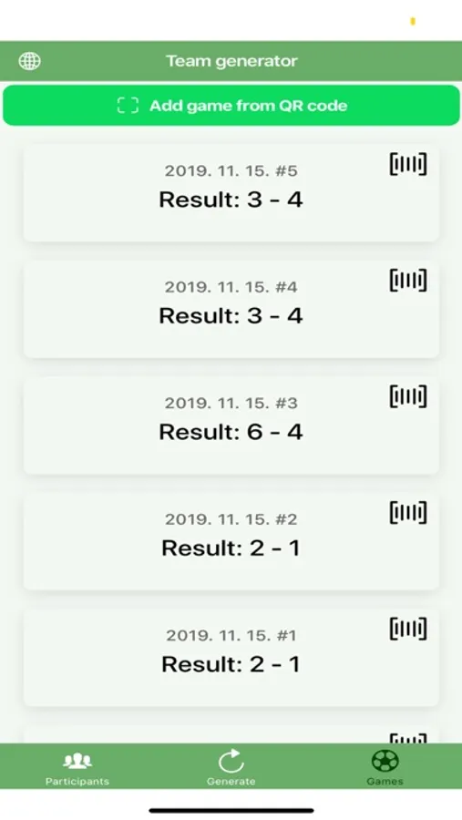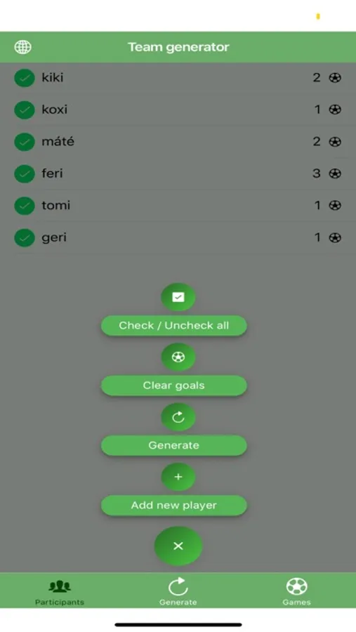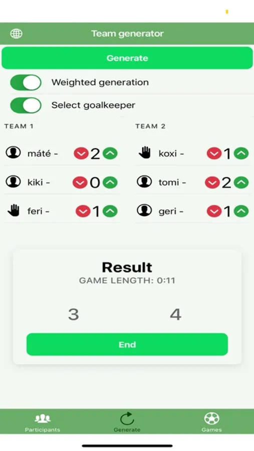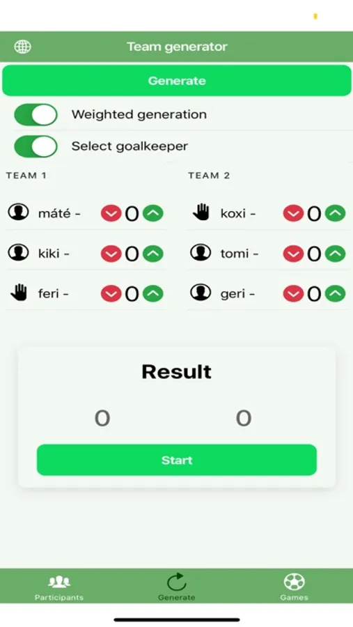 The app generates two random teams from the list of added players. The match results can be saved and sent over to another device via QR code. During the match, you can keep records of the scored goals by player, and for any subsequent team generations, the algorithm uses the goal numbers as weights to create balanced teams.