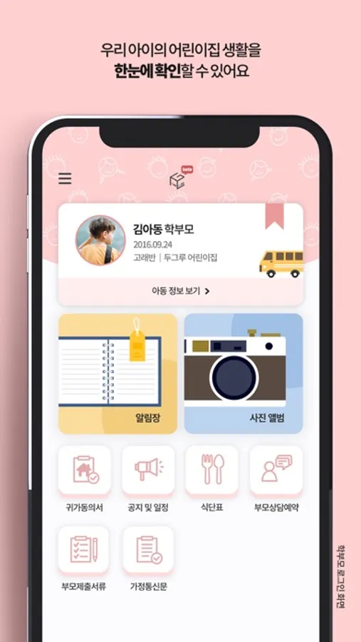 우리 아이들을 교육하면서 같은 관찰내용 등을 여러 서류에 반복적으로 수기 기록해야 하는 불편함을 해소하고 종이서류로 진행되던 수많은 학부모와의 소통절차를 간소화하기 위해 여러 기능을 개선하였으니 많은 이용을 바랍니다.