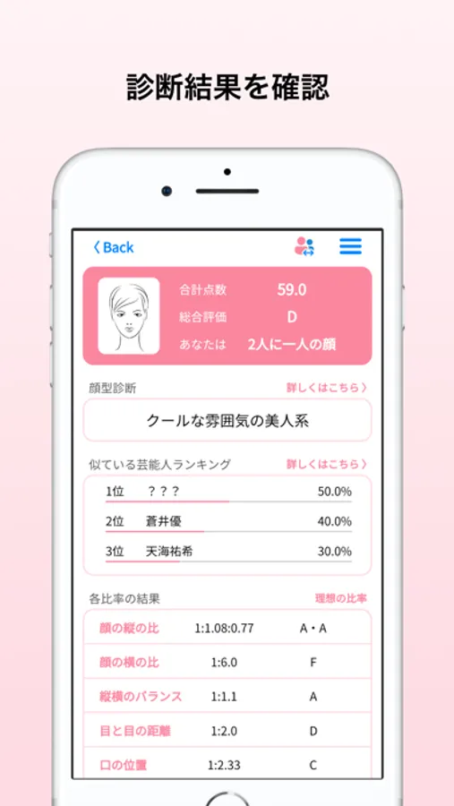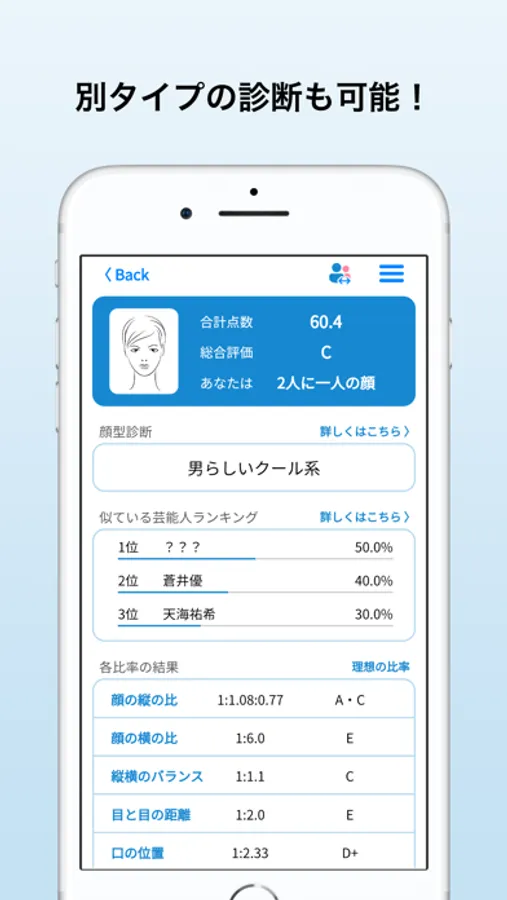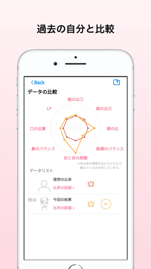 ・顔のパーツごとの比を表示し、7段階のランク付けによって理想の比との差を確認可能