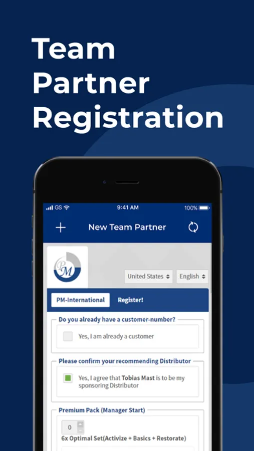 Team Partner Registration. Get rid of paper registration forms or slow computers! Now you can easily register new Team Partners with the help of the App. Whenever and wherever people around you decide to join PM-International, you can open the App and register them in a few minutes.