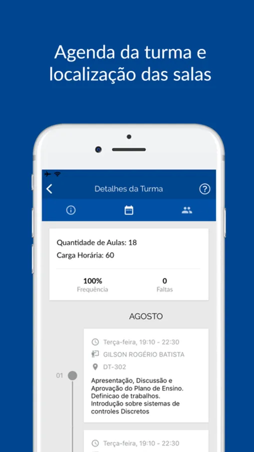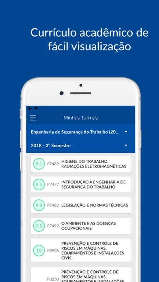 Visualize o seu currículo acadêmico, acompanhe as informações das suas turmas, notas, agenda e localização das salas de aulas.