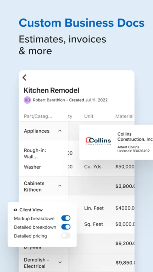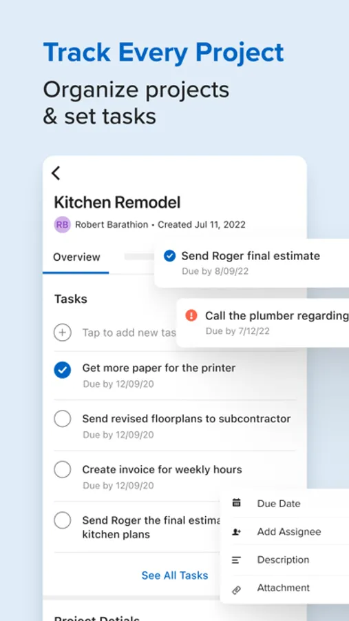 - Estimate & Propose: Send estimates & proposals for review / approval to keep projects moving forward.
