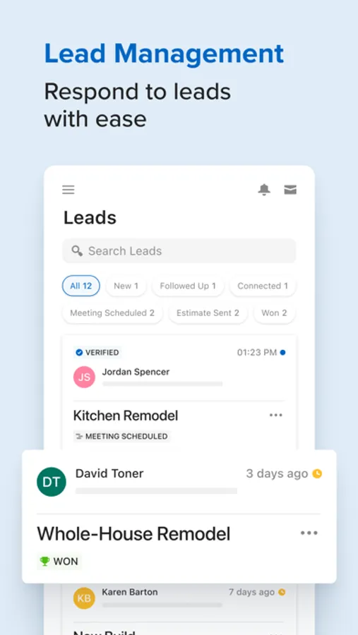 Lead management is easy with Houzz. Import leads from any source to organize and simplify communication with prospects. Move leads through stages to at a glance when it’s time to reach out with next steps.