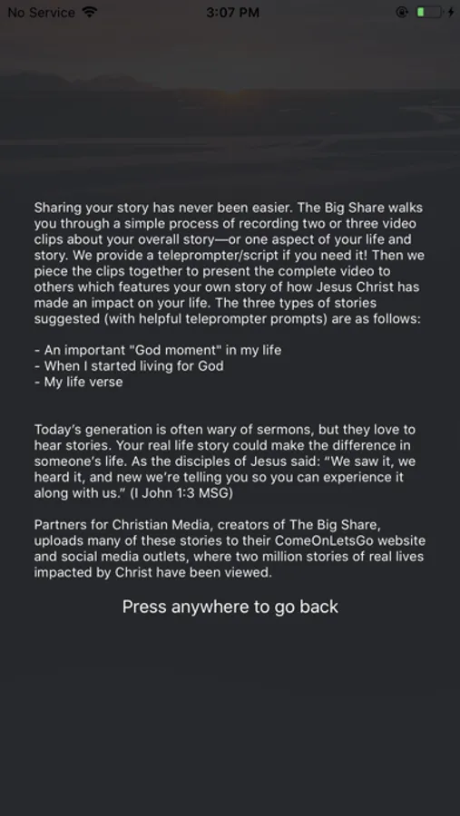 Sharing your story has never been easier. The Big Share walks you through a simple process of recording two or three video clips about your overall life story—or one aspect of your story. We provide a teleprompter/script if you need it! Then we piece the clips together to present the complete video to others which features your own story of how Jesus Christ has made an impact on your life. The three types of stories suggested (with helpful teleprompter prompts) are as follows: