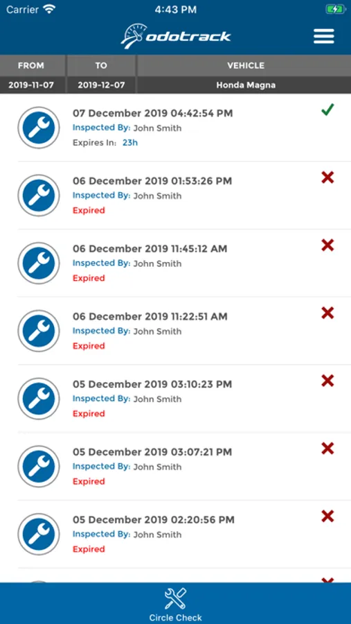 The ODOfleet application allows Odotrack’s customers to better manage their vehicle fleet. Thus, ODOfleet makes it possible to produce a Circle security check for each of its vehicles, by the driver directly or by another person designated by the operator.