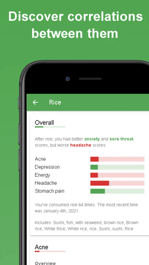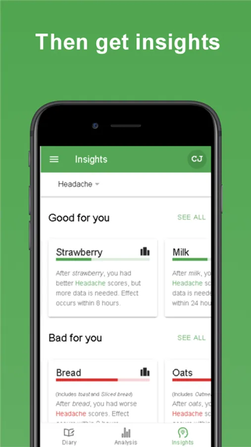 After keeping a food and health diary, you'll get recommendations on what foods make your conditions worse, and what foods make them better, as well as the strength and significance of the correlation and whether others have experienced the same thing.