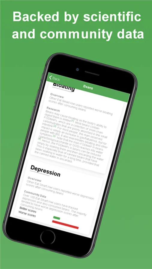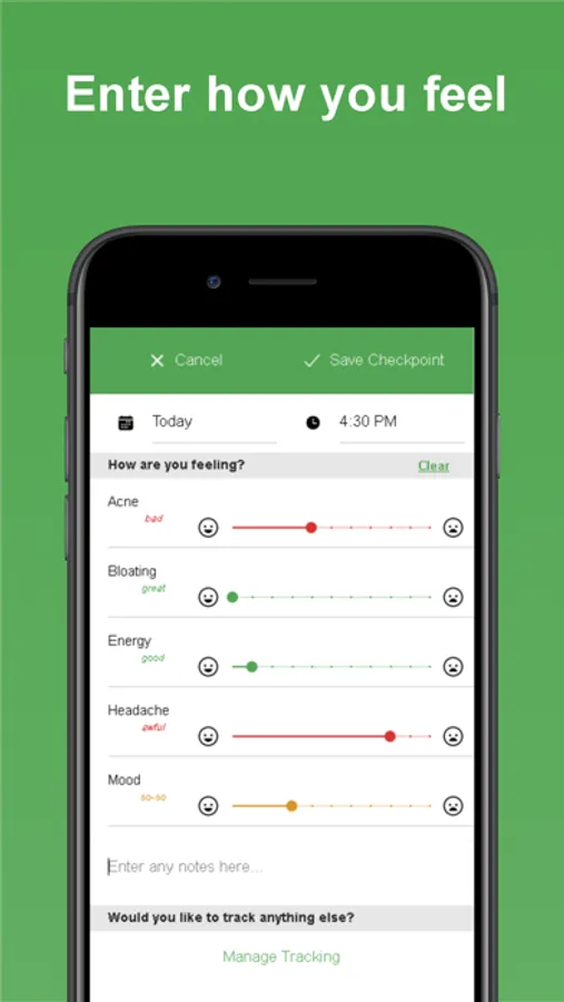 Eat Smart Kiwi helps you discover the effect of your eating on acne, bloating, stomach pain, headaches, energy levels, mood, or anything else you want to track. Every day, you record what you eat and how you feel, and we figure out all the correltaions between the two.