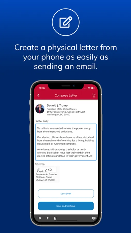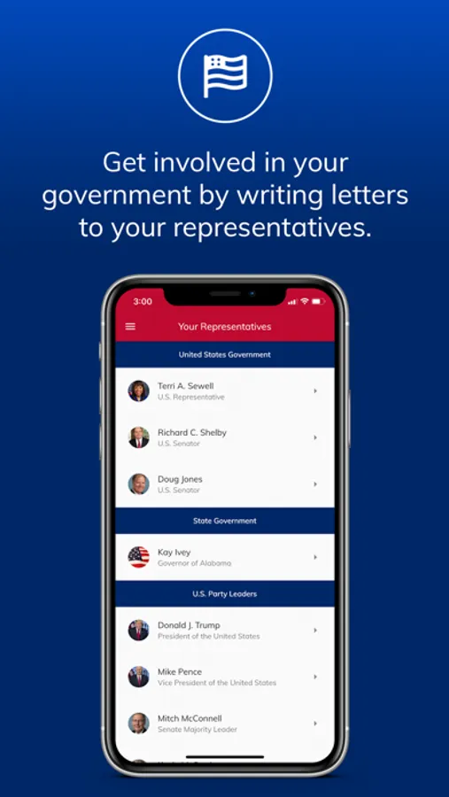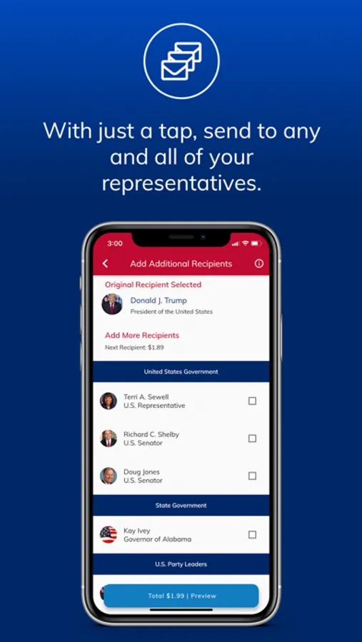 Mail letters to your US Congress Senators and Representatives, Party Leaders, The President, Vice President, Governor and State Legislators from your phone!