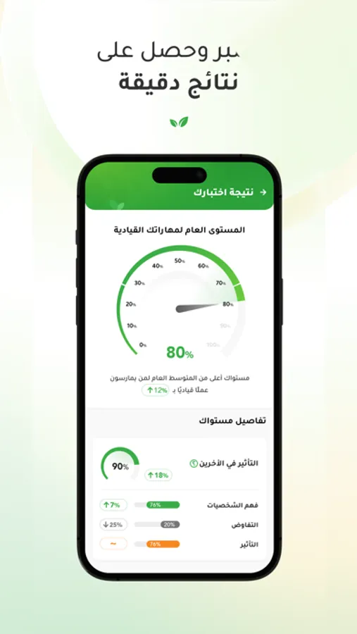 • نتائج فورية تفصيلية: تشمل العديد من مؤشرات القياس؛ لتساعدك على اكتشاف وتطوير ذاتك.