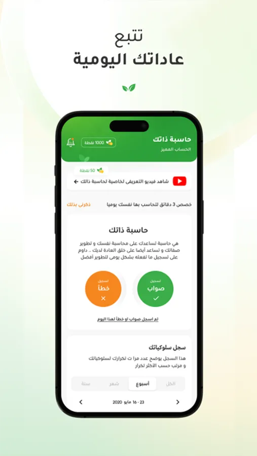 مع حاسبة ذاتك يمكنك أن تسجل سلوكياتك وأن تتبع عاداتك، سواء على مدار اليوم أو الأسبوع أو الشهر أو السنة؛ بحيث تستطيع قياس مدى تغيُّر سلوكياتك الإيجابية والسلبية بمرور الوقت!