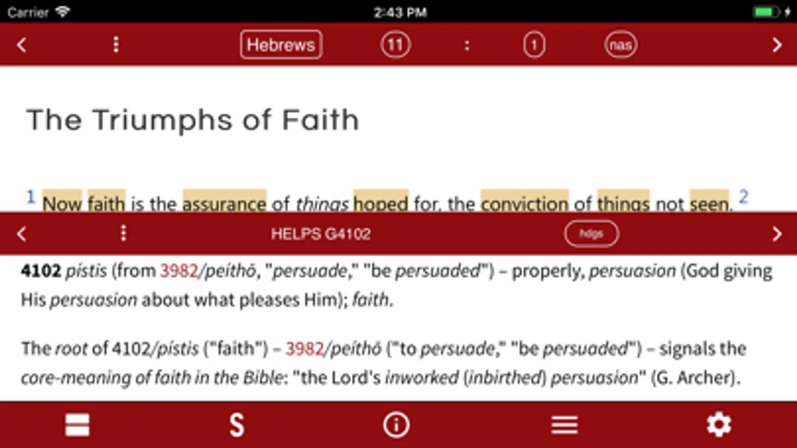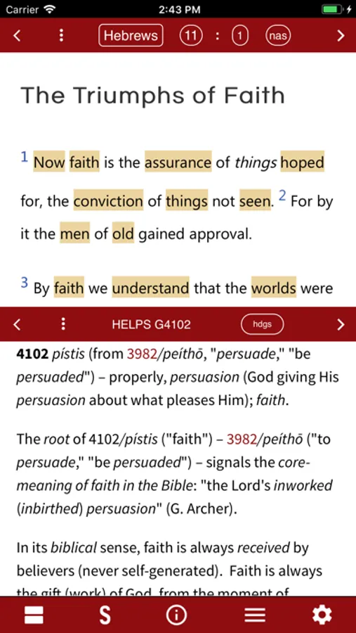 The HELPS Ministries App that has the words of the Bible labeled with their parts of speech, verb symbols, and has word studies similar to the well-known Discovery BIble book. A more complete version will be released in the future. Total storage after data download is approximately 125MB.