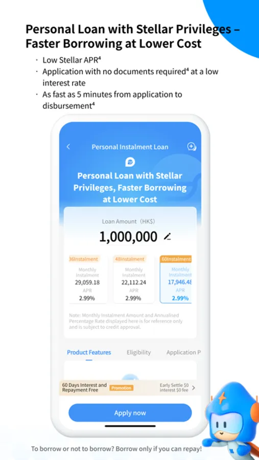 3. According to individual circumstances, the Bank reserves the right to request customers to provide additional supporting documents for approval. The approval time required is subject to real situation. Annualized Percentage Rate ("APR") is calculated in accordance with the method set out in the relevant guidelines referred to in the Code of Banking Practice and rounded up or down to the nearest two decimal places. APR is a reference rate which includes the basic interest rate and other fees and charges (if applicable) expressed as an annualized rate. The APR ranges from 1.58% to 35.81% with repayment period of 6 to 60 months. The example below is for illustrative purpose only. For a loan amount of HKD800,000 with 12 months repayment period with the APR being 1.58%, the total loan repayment amount is HKD806,819.66 (handling fee waived). Please refer to "Airstar Personal Instalment Loan Terms and Conditions" for details. This example and the resulting calculations do not constitute a quote or offer from the Bank and is not binding on the Bank. Approval of the APR is subject to the final decision of the Bank.