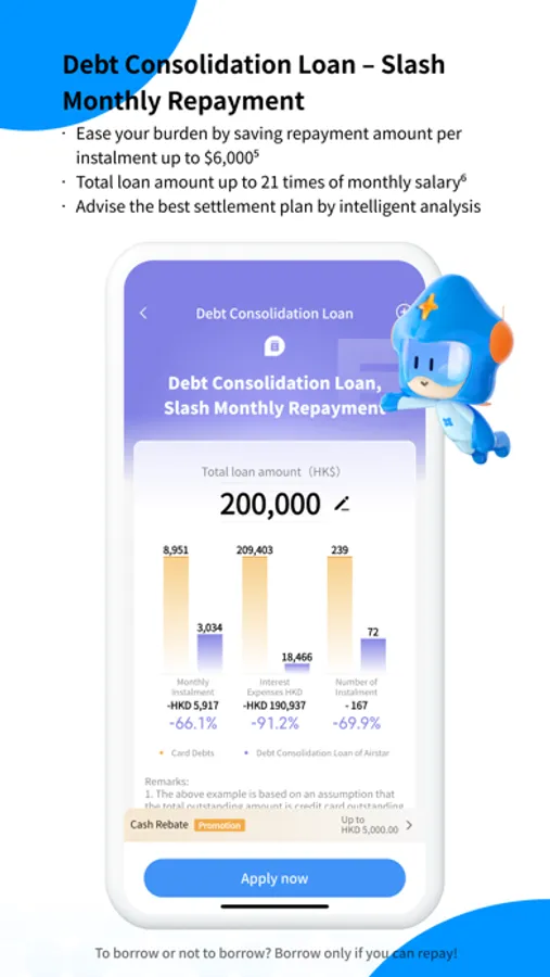 4. Interest saving example is based on an assumption that the total outstanding amount is credit card outstanding balance HKD200,000, with an annual interest rate of 30%, and monthly minimum repayment of 5% of the outstanding balance or HKD50 (whichever is higher). The APR is 34.49%. Monthly repayment amount is HKD8,952 and total interest expenses is HKD209,404. For Debt Con Loan with assumption that annual interest rate 2.95% and repayment tenor of 72 instalments, APR is 2.99%. Repayment amount per instalment is HKD3,034 and total interest expenses is HKD18,467. The average repayment amount per instalment and total interest expenses of above examples are rounded to nearest dollar. The above examples are for reference only.