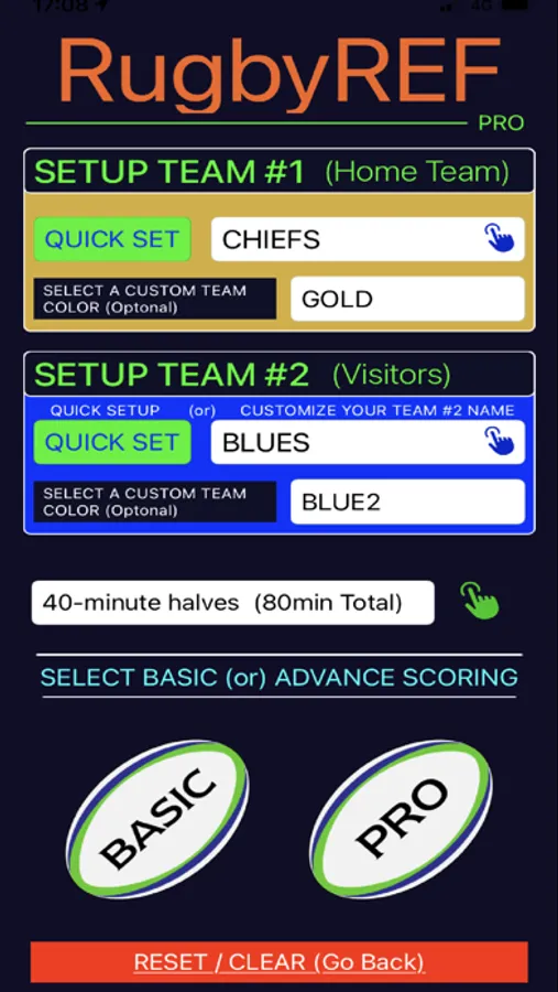 - Setup the TEAM NAMES and COLOURS (Quick or Custom)