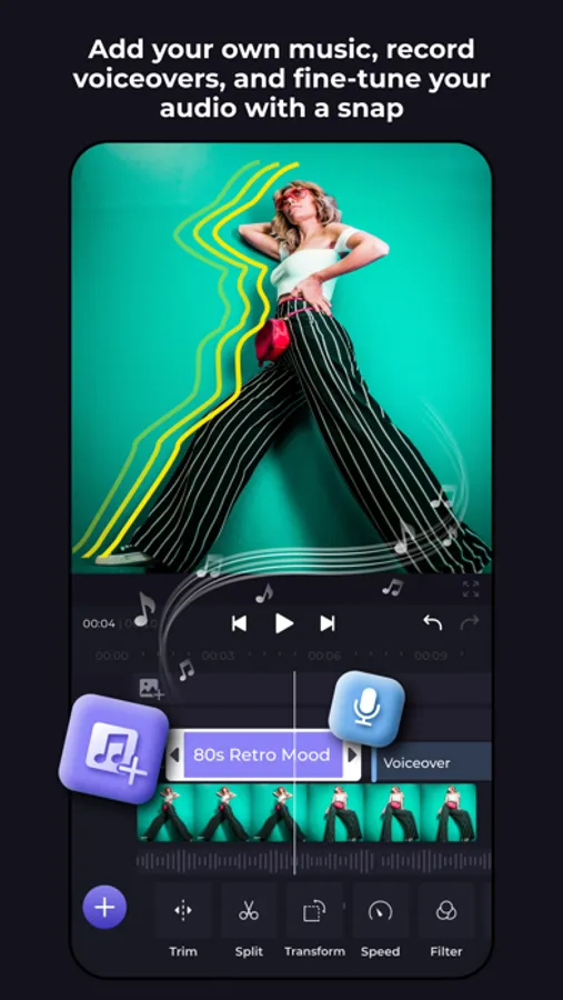 - Add videos and audio to edit, trim, split, speed up, and more.